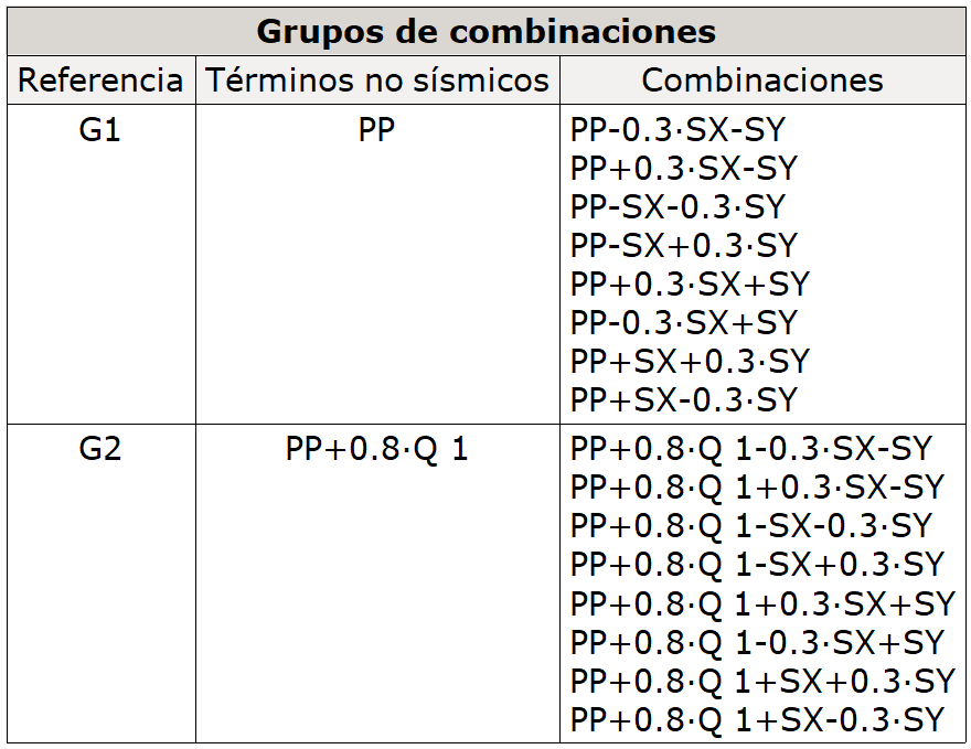 En el segundo grupo de combinaciones, al fijarse únicamente en las hipótesis no sísmicas, se puede observar que actúan el peso propio PP, con un coeficiente de combinación de 1, y la sobrecarga de uso Q1, con un coeficiente de combinación de 0.8.