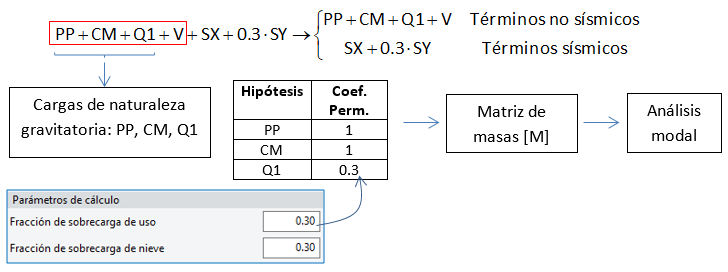 Para el cálculo de la masa sísmica, a partir de la cual se genera la matriz de masas, solamente se tiene en cuenta el peso propio con un coeficiente permanente de 1.