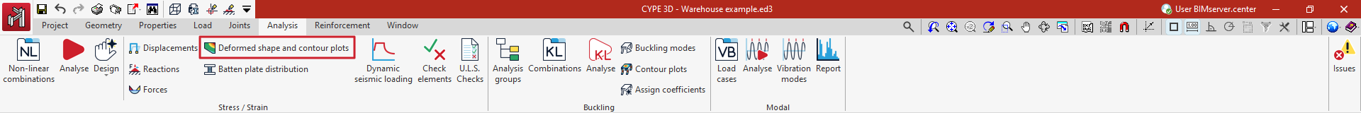 La deformada y los isovalores de la estructura se pueden consultar tras realizar el cálculo con la opción específica disponible en el bloque "Tensión / Deformación" de la barra de herramientas superior, dentro de la pestaña "Cálculo" (en la solapa "Estructura").