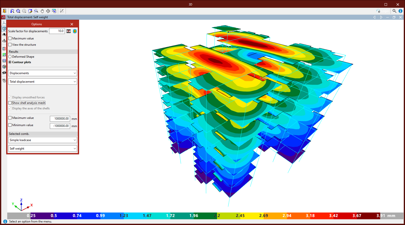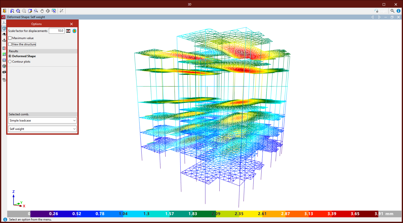 La configuración de las diferentes ventanas de visualización de la deformada y los isovalores está asociada a cada una de las vistas de la estructura de CYPE 3D. Se mantiene aunque se salga de la interfaz de la ventana de isovalores y hasta que se cierre el programa.