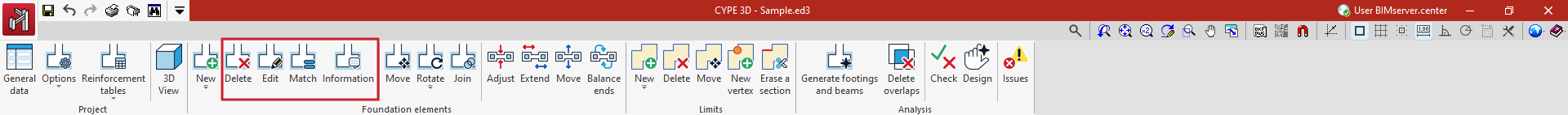 Las siguientes herramientas de edición de elementos de cimentación se encuentran disponibles en el bloque "Elementos de cimentación" de la parte superior de la interfaz, dentro de la pestaña "Cimentación".