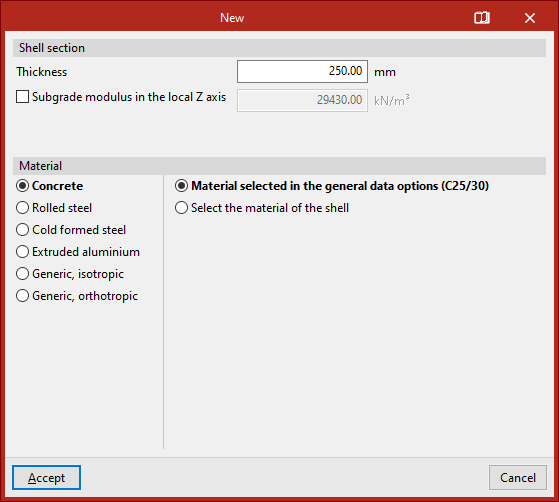 En la parte superior de la ventana "Nueva" se indican los datos de la "Sección de la lámina", incluyendo su "Espesor" en las unidades de medida seleccionadas.
