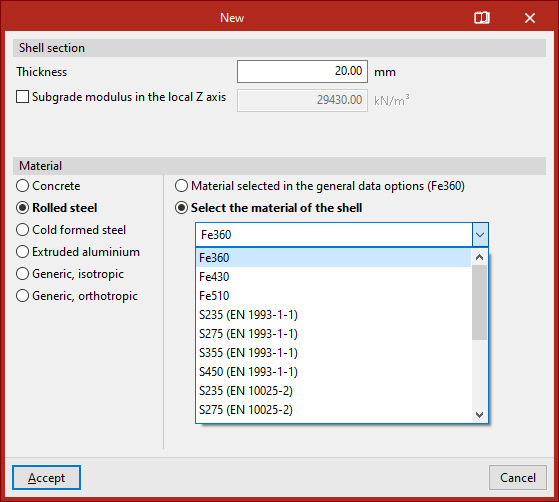 Más adelante, se define el "Material" de la lámina. Entre los disponibles, se encuentran los siguientes: