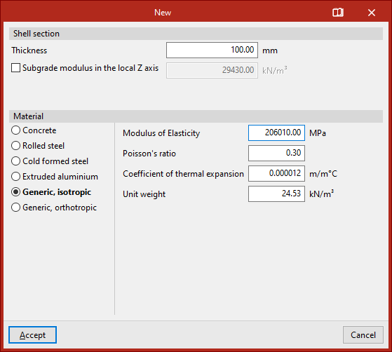 Si se escoge el material "Genérico, isótropo", se especifica directamente el "Módulo de elasticidad", el "Módulo de Poisson", el "Coeficiente de dilatación" y el "Peso específico".