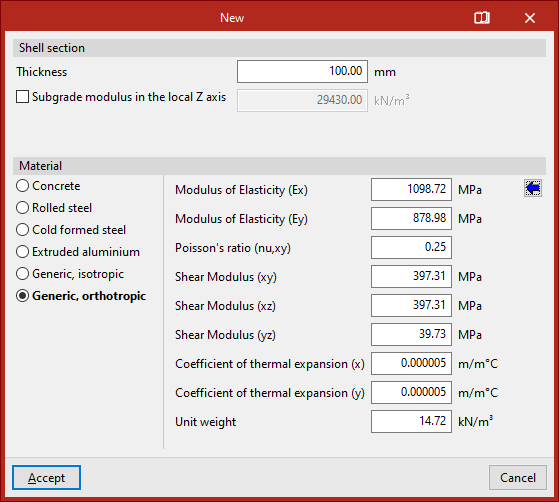 Si se escoge el material "Genérico, ortótropo", se debe especificar el "Módulo de elasticidad" en las dos direcciones X e Y (Ex, Ey), el "Módulo de Poisson (nu, xy)", el "Módulo de cortadura" en los planos xy, xz e yz, el "Coeficiente de dilatación" en las dos direcciones X e Y, y el "Peso específico".
