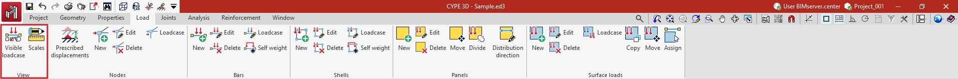 Las opciones para editar la visualización de hipótesis de cargas y modificar su escala están disponible en el bloque "Visualización" de la barra de herramientas superior, dentro de la pestaña "Carga" (en la solapa "Estructura").