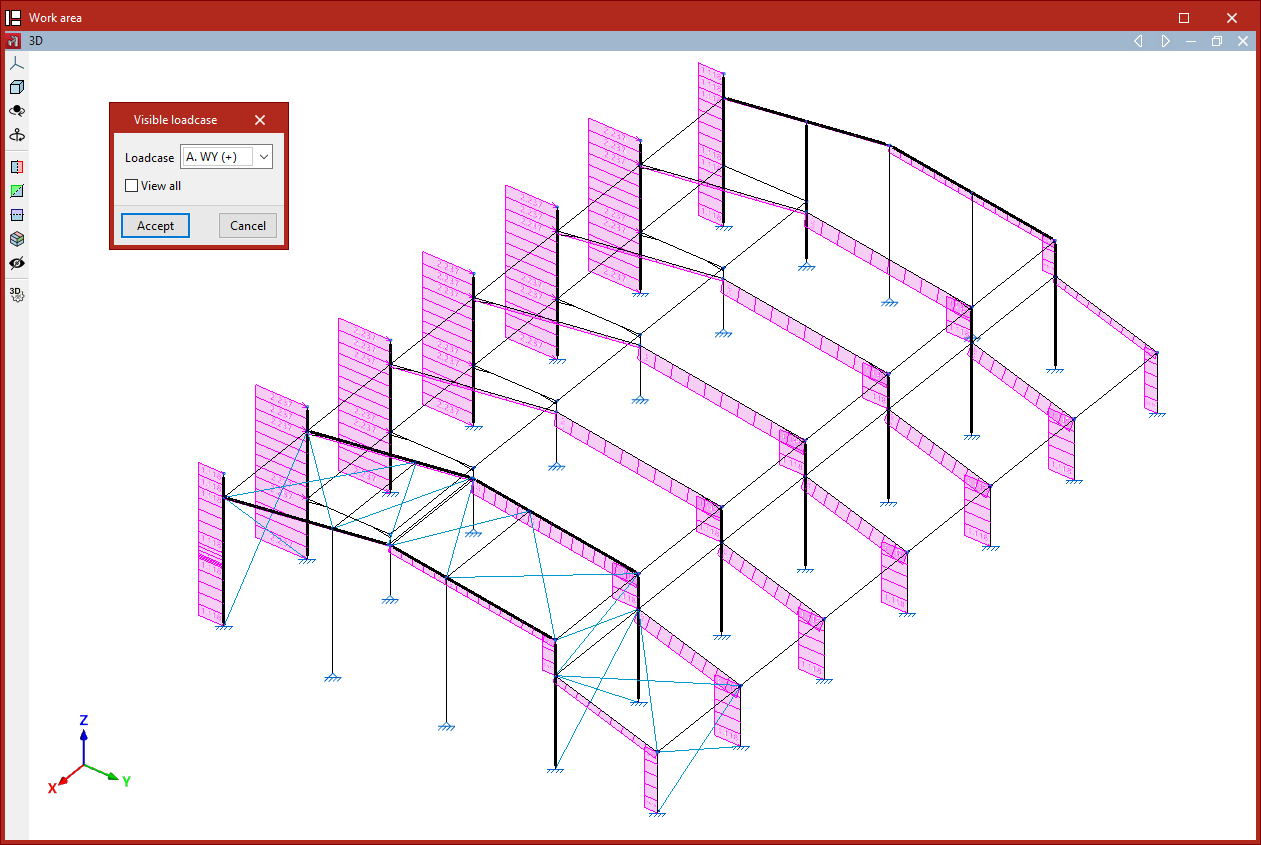 Si se accede de nuevo a la misma opción, se observa que también se puede activar la casilla "Ver todas". De esta forma, en el modelo se muestran las cargas asignadas a todas las hipótesis. Cada una de las hipótesis de cargas se representa con un color diferente.
