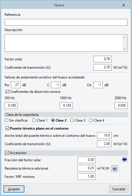 Este parámetro regula la radiación solar que permite pasar el accesorio y se constituye como la relación, en tanto por uno, entre el factor solar del lucernario con el accesorio activo y el factor solar del lucernario sin el accesorio. Un valor igual a la unidad implica que el accesorio deja pasar toda la radiación solar que incide sobre el lucernario, mientras que un valor igual a cero corresponde a un sombreamiento completo. - Resistencia térmica adicional