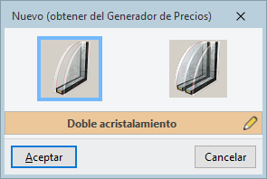 La introducción de un tipo de acristalamiento se puede realizar obteniendo la información a partir del Generador de precios. Esta base de datos agrupa las tipologías de acristalamientos en diferentes familias: