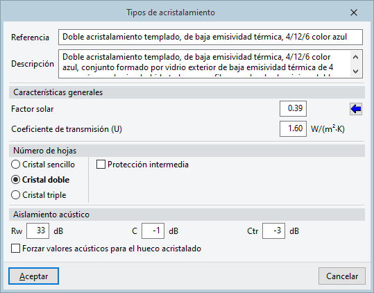 Los parámetros necesarios en la configuración manual de un tipo de acristalamiento son los siguientes: