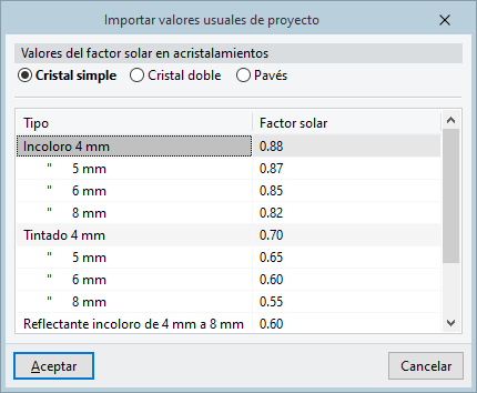 Fracción de la radiación solar que permite pasar el acristalamiento. El asistente a la derecha permite importar valores usuales de proyecto. - Coeficiente de transmisión (U)