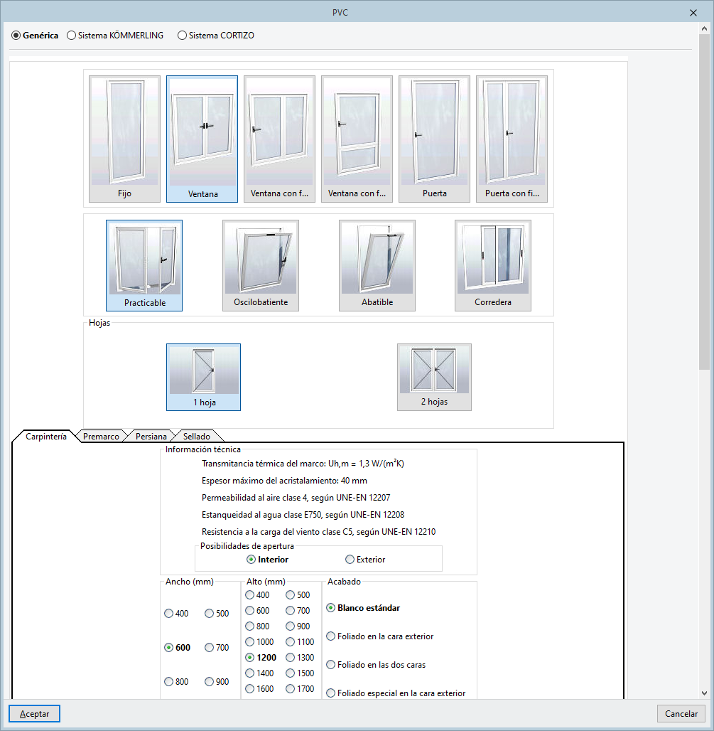 La introducción de un tipo de carpintería se puede realizar obteniendo la información a partir del Generador de precios. Esta base de datos agrupa las tipologías de carpinterías en diferentes familias: