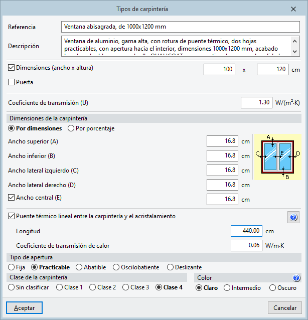 Los parámetros necesarios en la configuración manual de un tipo de carpintería son los siguientes: