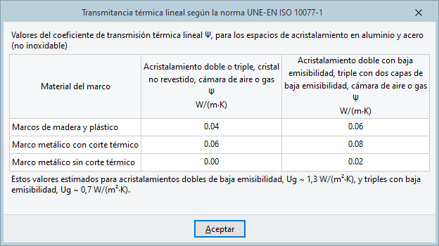 Permite considerar y definir las dimensiones y características del puente térmico lineal en el límite entre el marco y el acristalamiento. La ayuda a la derecha ofrece diferentes valores de "Transmitancia térmica lineal según la norma UNE-EN ISO 10077-1".- Longitud