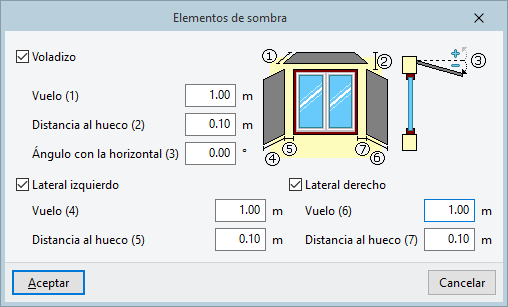 Los elementos de sombra permiten simular el efecto de salientes de fachada como los retranqueos, los voladizos sobre la ventana o las proyecciones laterales que producen sombreamiento sobre el hueco, en caso de que no hayan sido definidos en el modelo geométrico directamente (dibujando elementos como muros y particiones o forjados).