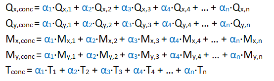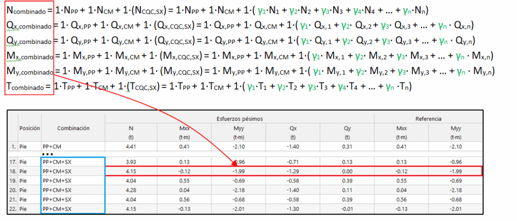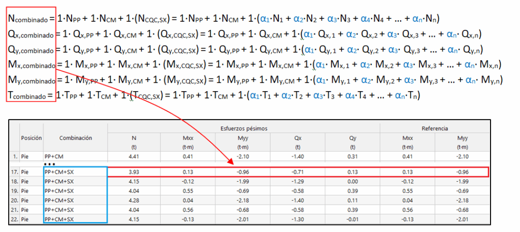 Los esfuerzos concomitantes con dicho axil máximo se obtienen combinando linealmente el resto de esfuerzos utilizando los coeficientes calculados para el axil (α1, α2, α3, α4,…, αn):