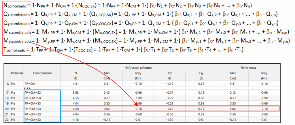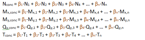 Los esfuerzos concomitantes con dicho cortante máximo se obtienen combinando linealmente el resto de esfuerzos utilizando los coeficientes calculados para el cortante (β1, β2, β3, β4,…, βn):