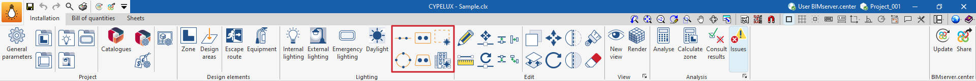 En el bloque "Iluminación" de la barra de herramientas principal de la pestaña "Instalación", se encuentran las opciones para disponer automáticamente conjuntos de luminarias en el modelo utilizando distintos tipos de distribución: