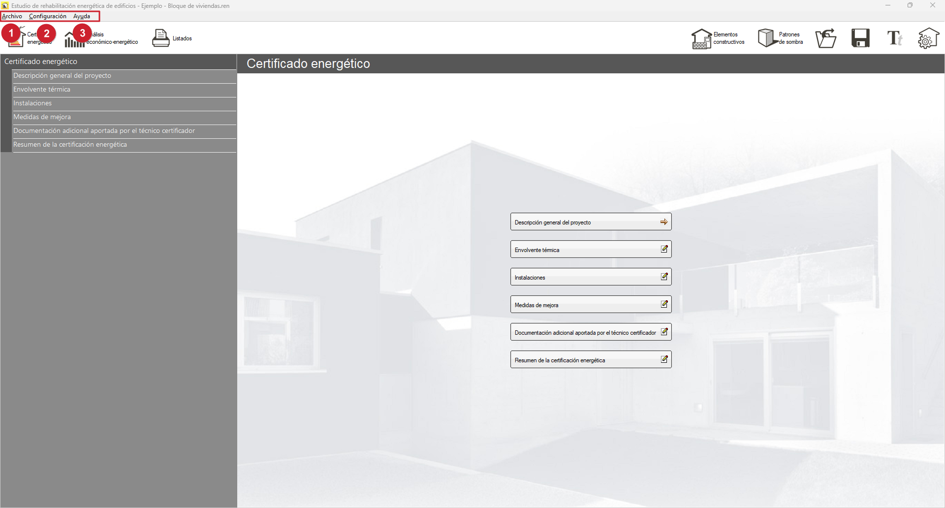 Herramientas generales de la interfaz de Estudio de rehabilitación energética de edificios