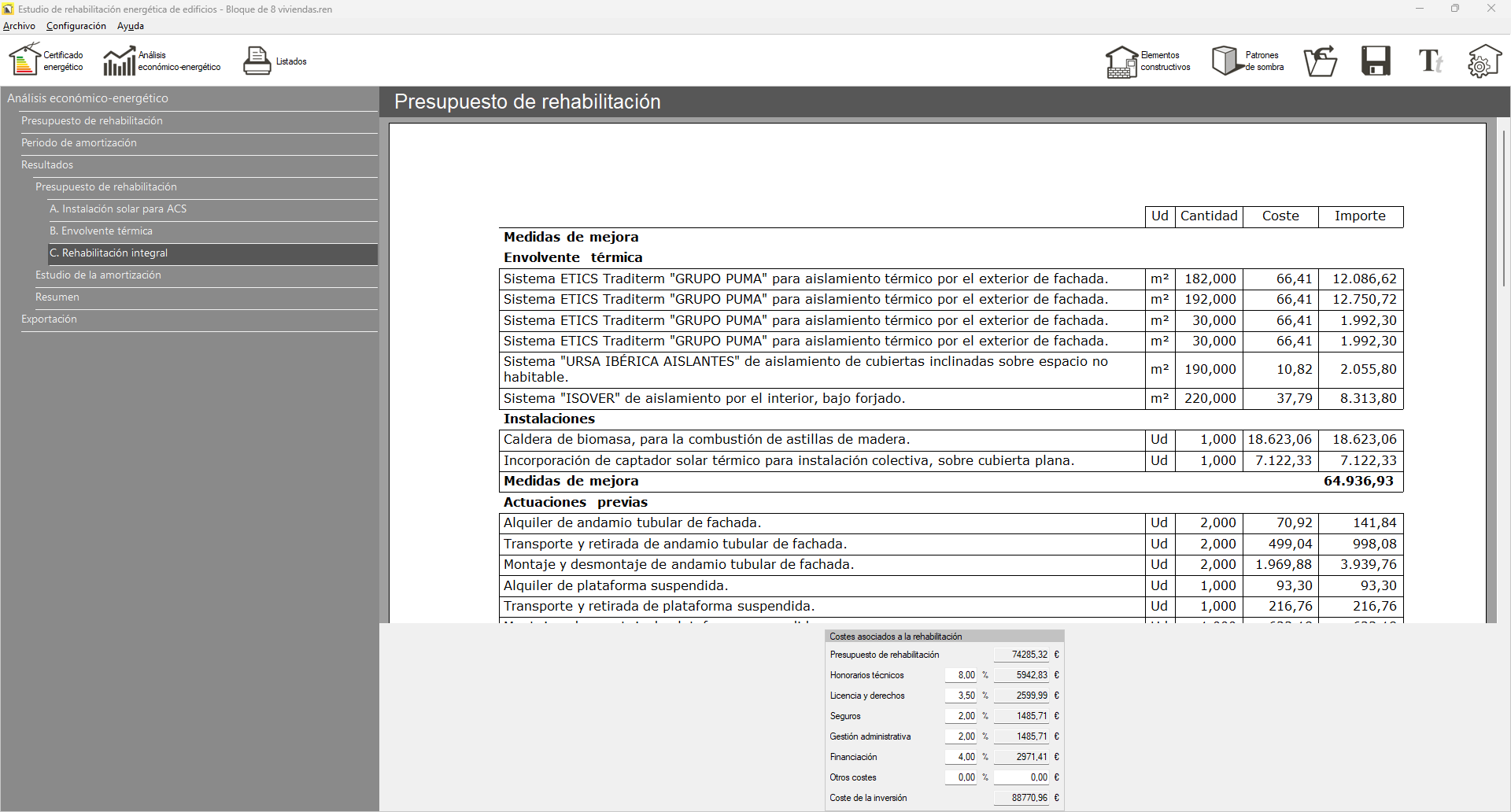El presupuesto de las medidas de mejora de la rehabilitación energética se obtiene mediante la selección por parte del usuario de diferentes soluciones constructivas reales, ofrecidas por las principales casas comerciales que lideran el mercado de la rehabilitación energética en España, y recogidas, todas ellas, en el Generador de precios. Además incluye el coste de todos aquellos trabajos necesarios para el correcto desarrollo de las obras y el cumplimiento de la normativa vigente, tales como el montaje de andamios y maquinaria de elevación, el desmontaje de los elementos de fachada y cubierta, la protección de elementos constructivos durante la ejecución de la obra, el embalaje y, en su caso, el traslado y transporte de mobiliario.