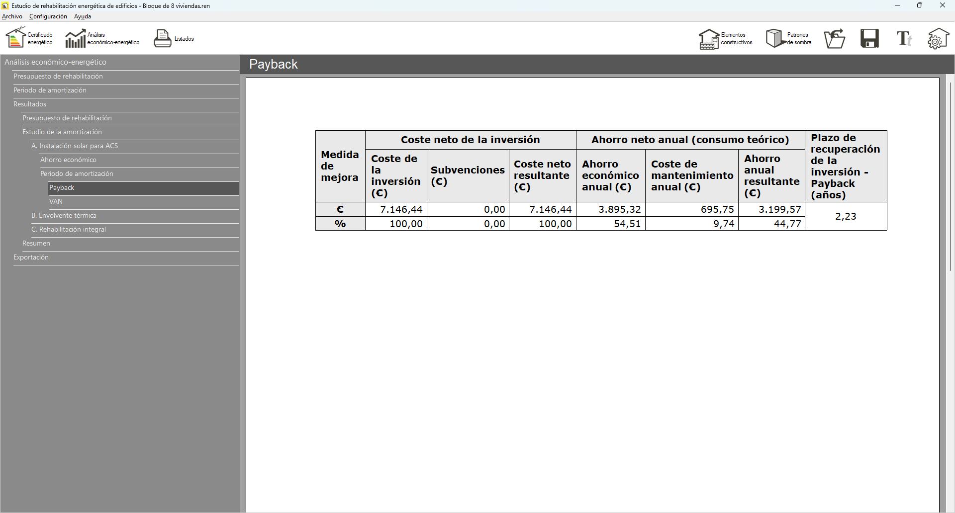 Para realizar este análisis, el programa tiene en cuenta los costes de mantenimiento y las posibles ayudas y subvenciones que el usuario indique. Adopta un criterio estático de valoración de inversiones, que determina el tiempo necesario para recuperar la inversión inicial a través de los flujos de caja netos, es decir, mediante la diferencia entre los ingresos y los gastos previstos en el proyecto, sin tener en cuenta la fluctuación de su valor en el tiempo.