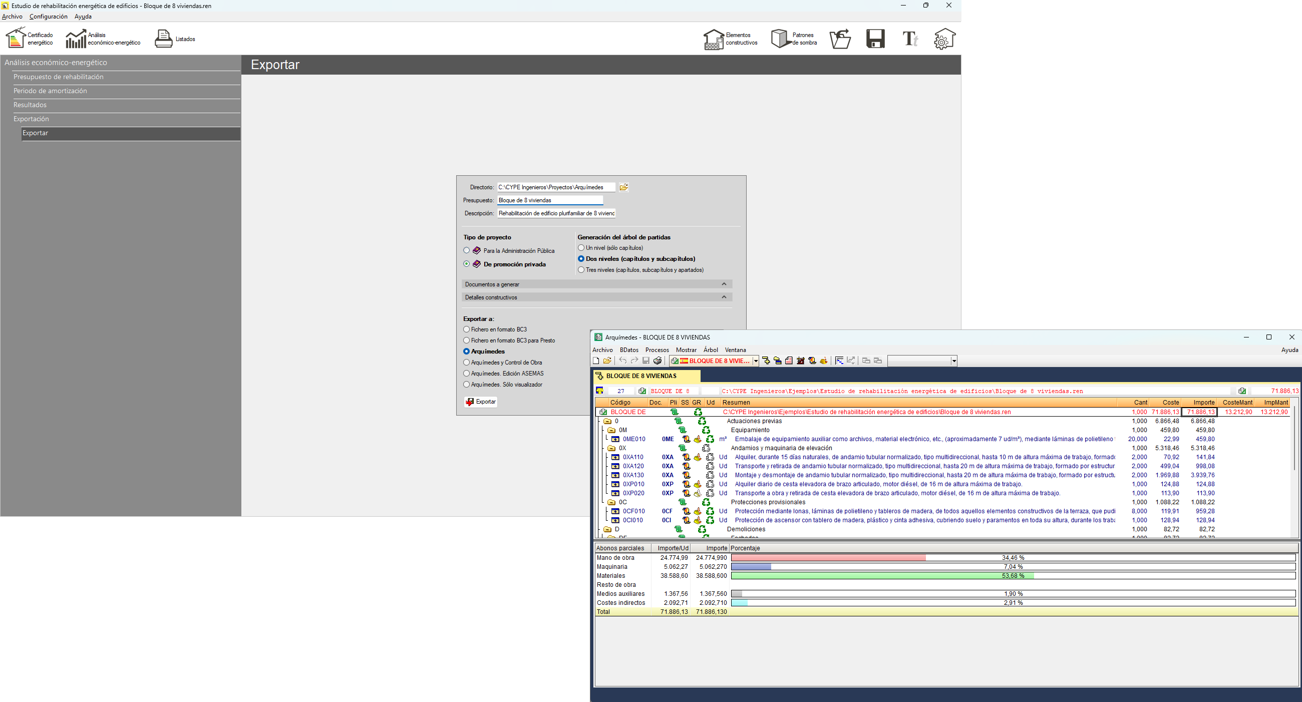 Estudio de rehabilitación energética de edificios permite exportar a un archivo en formato BC3 o a Arquímedes, las medidas de mejora seleccionadas para presupuestar en la sección "Exportación" de la pestaña "Análisis económico-energético", ubicada en el área superior izquierda de la interfaz.