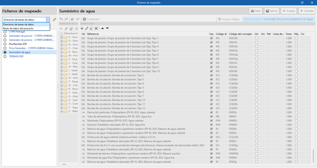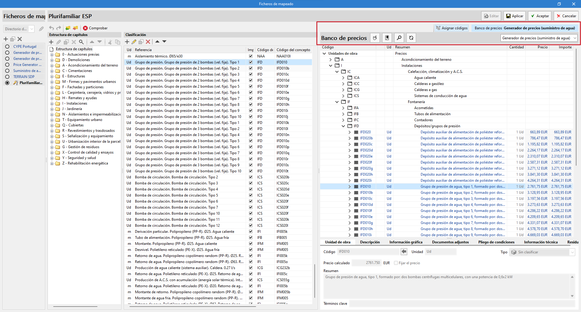 Las aplicaciones con solapa “Presupuesto” emplean “Ficheros de mapeado” en combinación con el “Banco de precios” en un proyecto para establecer la relación entre los elementos del modelo (definidos en la solapa “Instalación”) y los conceptos del banco.