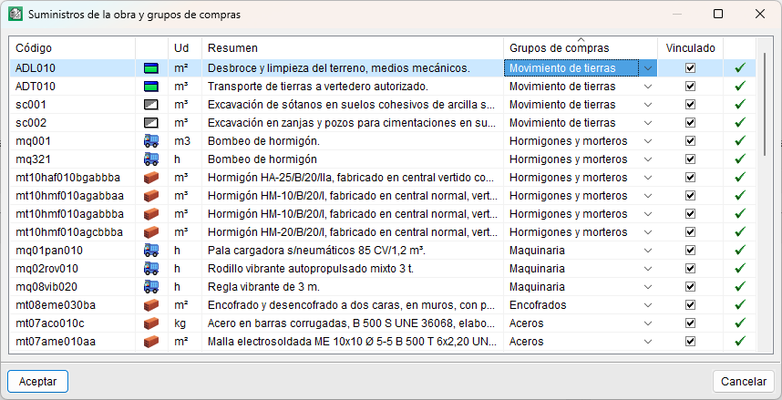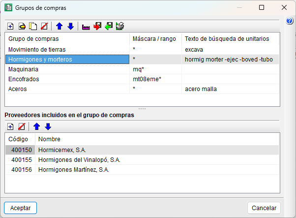 La generación de estos grupos facilita la solicitud de ofertas. Por ejemplo, cuando se detecta la necesidad de comprar hormigones, se pueden solicitar ofertas a los proveedores del grupo de compras "Hormigones y morteros" que incluirán todos los suministros de ese grupo de compras.