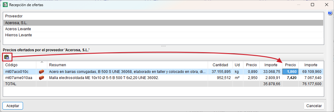 El botón "Pegar" del diálogo "Recepción de ofertas" (menú "Control de obra", "Gestión de compras"), copia el contenido del portapapeles de Windows a la tabla de recepción de ofertas del proveedor seleccionado. Para que los datos del portapapeles de Windows sean utilizables en Arquímedes, antes se ha debido copiar al portapapeles una tabla del documento que manda el proveedor. Dicha tabla puede copiarse de cualquier formato de fichero en el que el proveedor manda sus ofertas (hoja de cálculo, procesador de texto, PDF, etc.). El procedimiento que ha de seguirse es el siguiente: