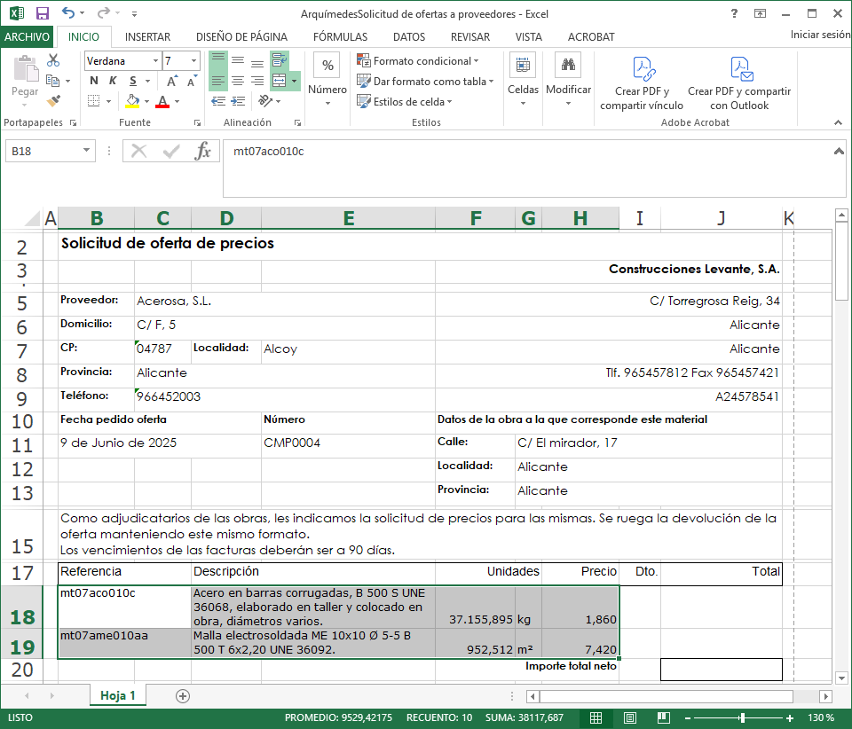 - Abrir el documento que se ha recibido del proveedor. La información que Arquímedes necesita de este documento son los precios que ofrece el proveedor y su código.