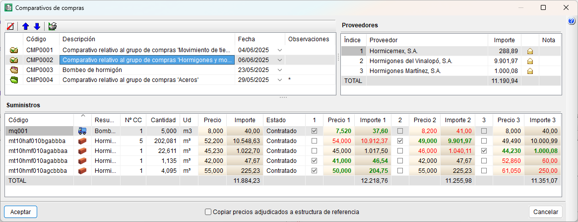 Con la opción "Comparativos de compras" es posible visualizar las ofertas recibidas para seleccionar la mejor y poder preparar los contratos. Como ayuda, en el diálogo donde se visualiza el comparativo de compras se destacan en color verde los precios más bajos y en color rojo los más altos. También se representan los totales de los suministros seleccionados por proveedor y futuro contrato.