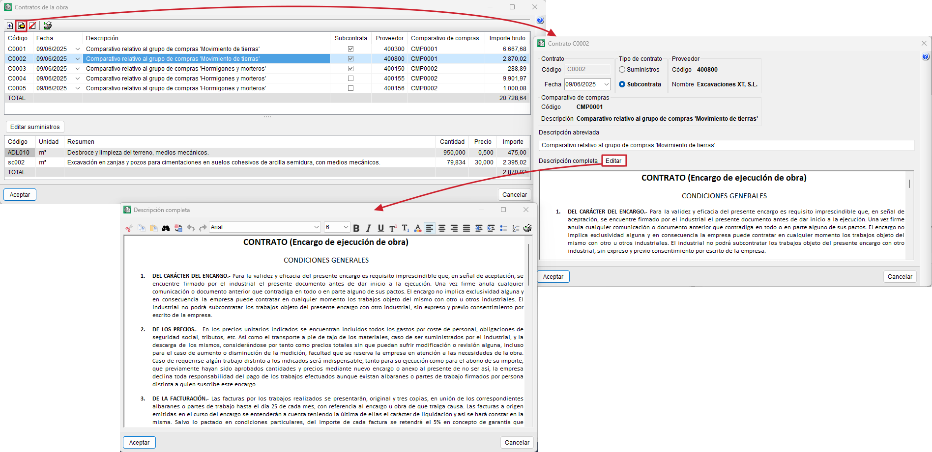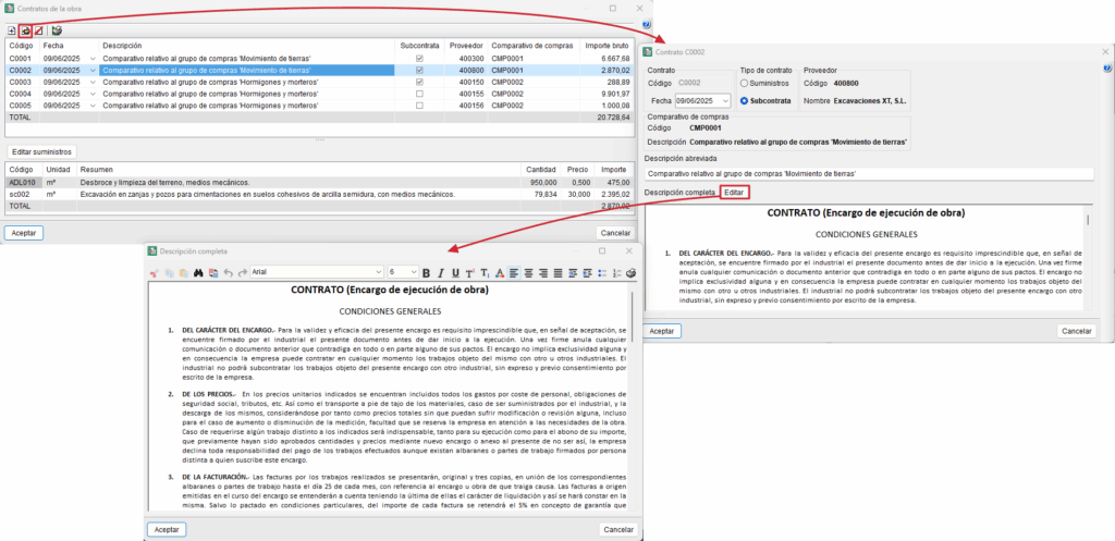 Con la opción "Generar contratos" el usuario puede crear los contratos de los proveedores (contratos de suministro o alquiler) y de los subcontratistas (contratos de ejecución) que estén pendientes de contratar. La opción "Contratos de la obra" abre un diálogo que contiene la lista de contratos generados para visualizarlos y editarlos. La edición de un contrato abre un editor de textos desde el que es posible: