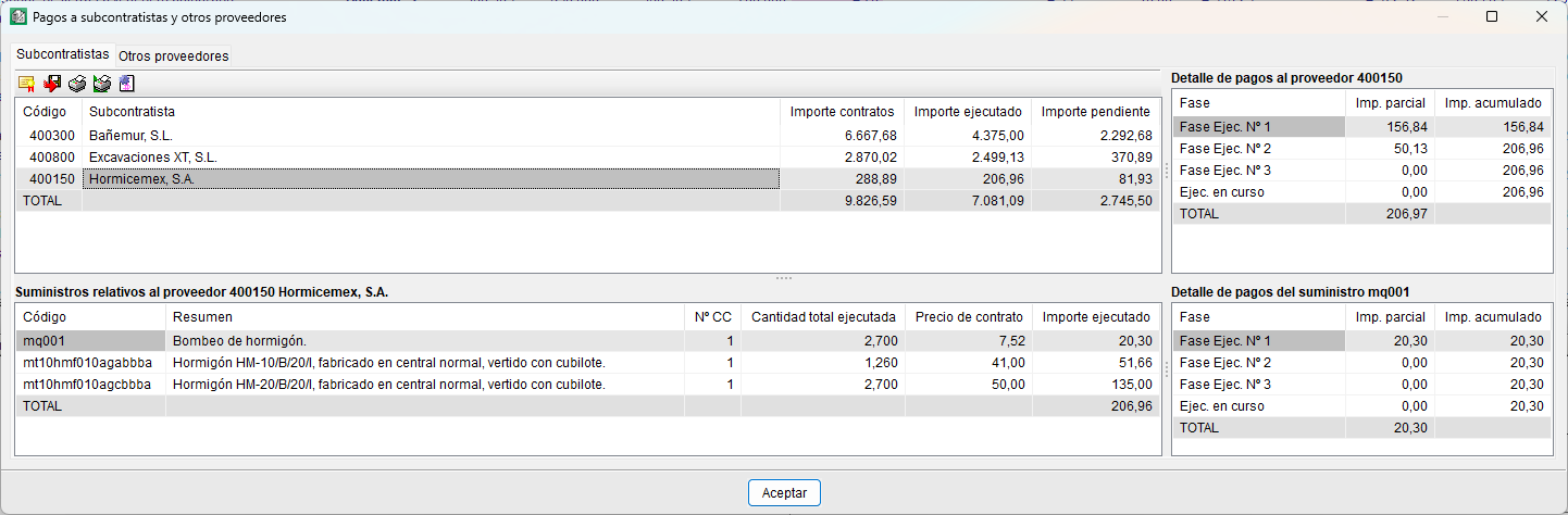 En el diálogo "Pagos a subcontratistas y otros proveedores" (menú "Control de obra", "Ver") es posible visualizar la previsión de pagos a subcontratistas y otros proveedores detallada por proveedor y por fases de ejecución o meses. También se pueden consultar los suministros de cada proveedor y el detalle de pagos de cada uno de los suministros.
