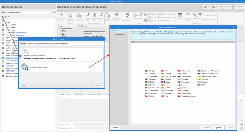 Es posible crear un banco de precios basado en conceptos unitarios del "Generador de precios", para el país y el emplazamiento seleccionados, mediante la opción "Generador de precios - CYPEPLUMBING (versión - fecha y hora)".