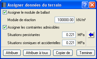 A été implémentée l’option Assigner données du terrain (onglet Entrée des poutres > menu Poutres/Murs) qui permet de définir le module de ballast et les contraintes admissibles du terrain sous les poutres de fondation et les radiers introduits, sans avoir besoin d’éditer ces éléments de fondation.