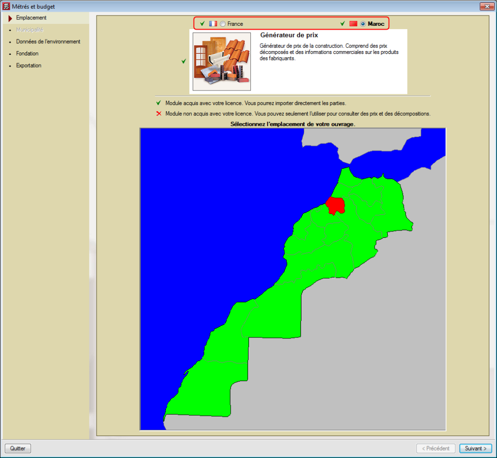 Dans la version 2013.b, CYPECAD permet la génération du budget et du métré grâce à sa connexion avec le Générateur de prix du Maroc. Pour cela, vous devez installer CYPECAD en français et l’ouvrage doit être calculé avec les normes en vigueur au Maroc. Dans ce cas, le logiciel permettra à l’utilisateur de choisir entre le Générateur de prix de France ou celui du Maroc.