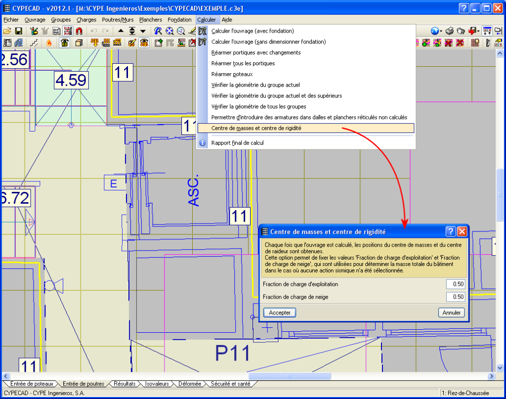 Ainsi, à partir de la version 2012.l, chaque fois que la structure est calculée, les positions du centre de masses et du centre de rigidité sont obtenues à chaque étage. C’est pourquoi le logiciel doit connaître les valeurs de la fraction de la surcharge d’utilisation et de la fraction de la surcharge de neige, qui sont utilisées pour déterminer la masse totale du bâtiment. Ces deux valeurs sont indiquées par l’utilisateur dans la boîte de dialogue où sont introduits les paramètres qui définissent l’action sismique. Dans le cas où le calcul sismique de la structure n’est pas activé, ces deux valeurs sont spécifiées avec la nouvelle option Centre de masses et centre de rigidité (menu Calcul). Cette option du menu Calcul est également disponible lorsque l’action sismique est activée mais, dans la boîte de dialogue qui apparaît, seule la fraction de charge d’exploitation et de neige est indiquée à titre informatif et coïncide avec celle que vous avez introduite dans les données de l’action sismique (menu Ouvrage > Données générales > sélectionner l’option Avec séisme > sélectionner la norme de séisme correspondante).