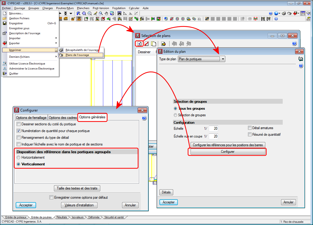 A été implémentée l’option Disposition de références dans les poutres continues groupées (menu Fichier > Imprimer > Plans de l’ouvrage > bouton Ajouter > sélectionner dans "Type de plan" Plan de poutres continues > bouton Configurer > onglet Options générales) qui permet de placer les références des poutres groupées les unes à côté des autres (option Horizontalement) ou les unes sous les autres (option Verticalement).