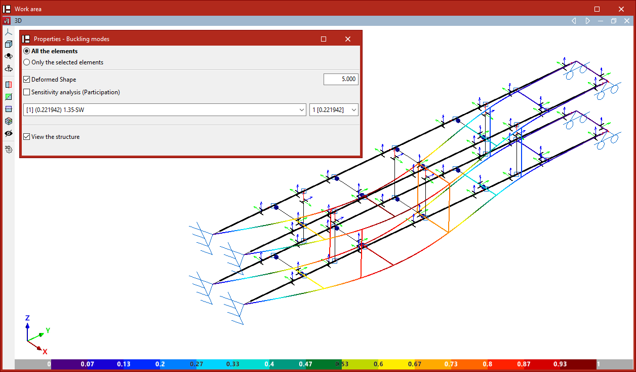 L'analyse de sensibilité permet de déterminer quels modes de flambement affectent chaque barre afin de calculer et d'attribuer les coefficients de flambement. Pour ce faire, dans les deux cas précédents, le ‘Pourcentage de participation minimal de la barre dans le mode’ est indiqué afin que son coefficient de flambement soit mis à jour.