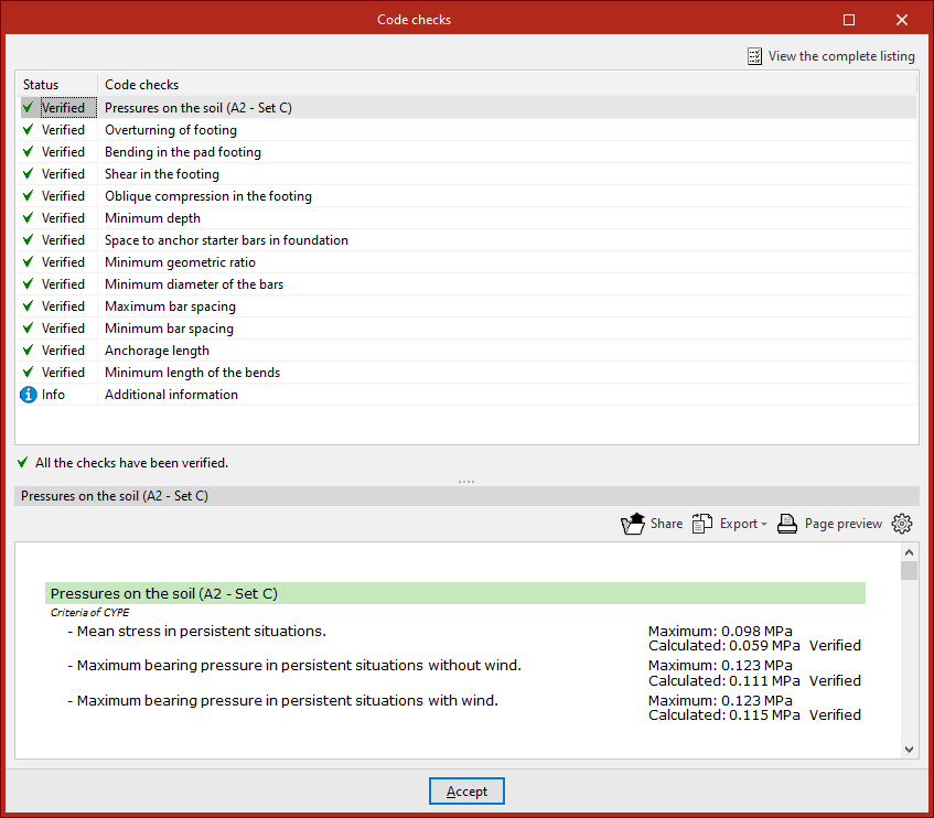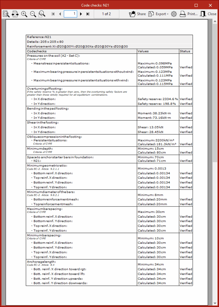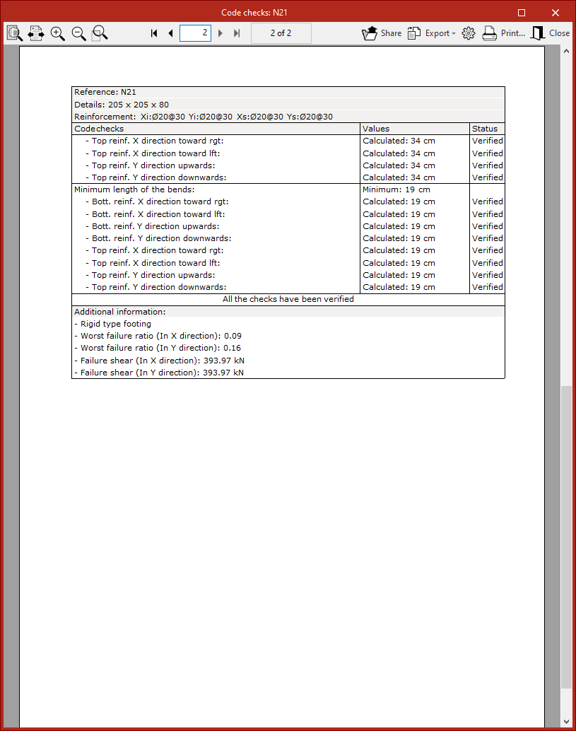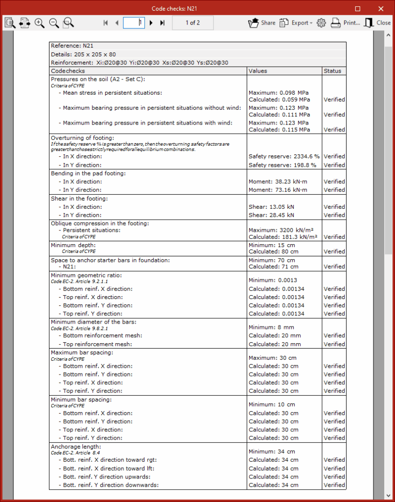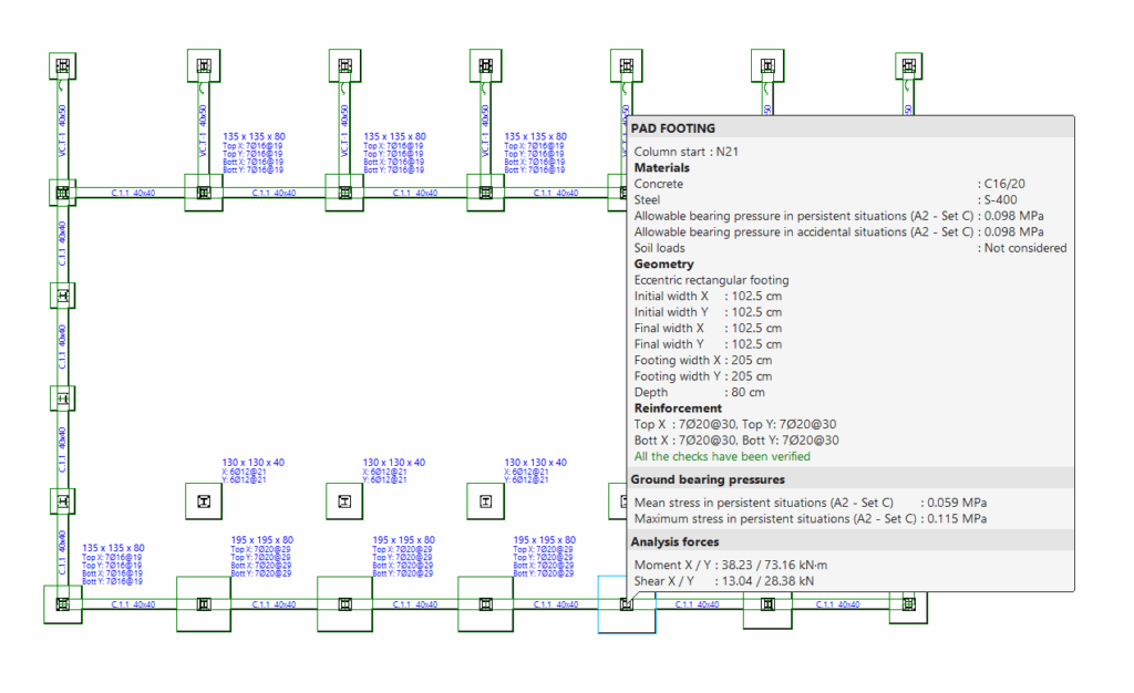 L'option ‘Vérifier’ permet de vérifier tous les éléments de la fondation sans apporter de modifications, aussi bien les semelles superficielles et sur pieux que les poutres.