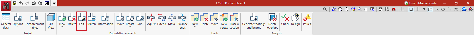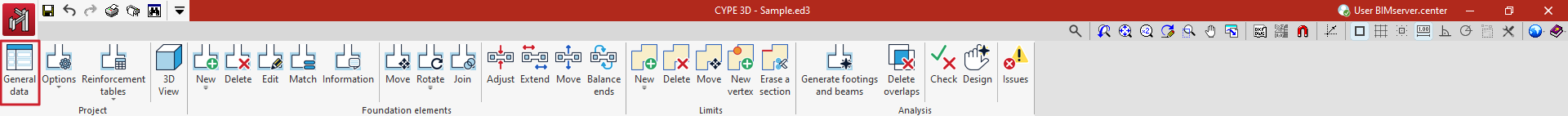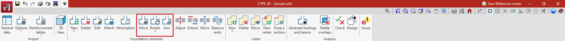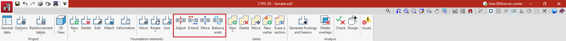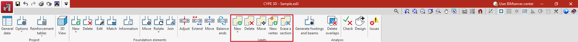 L'introduction des limites des éléments de fondation dans le logiciel se fait avec les options du bloc ‘Limites’ en haut de l'interface, dans l'onglet ‘Fondation’.
