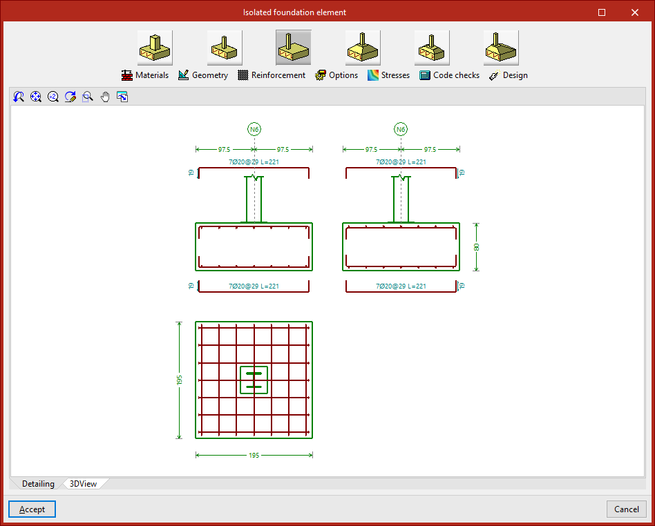 L'option ‘Dimensionner’ permet de dimensionner simultanément les éléments qui composent la fondation, y compris leur géométrie et leurs armatures.