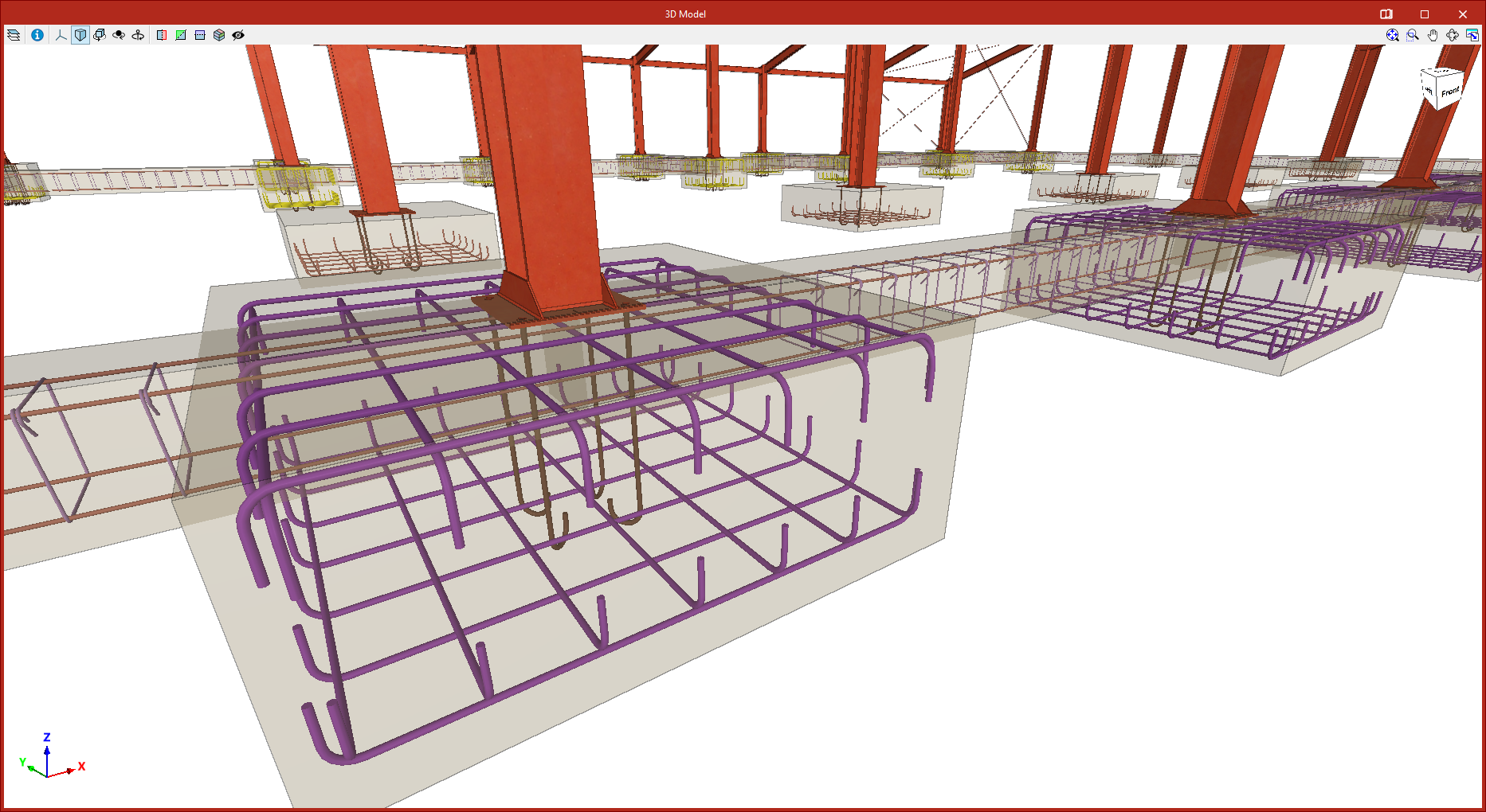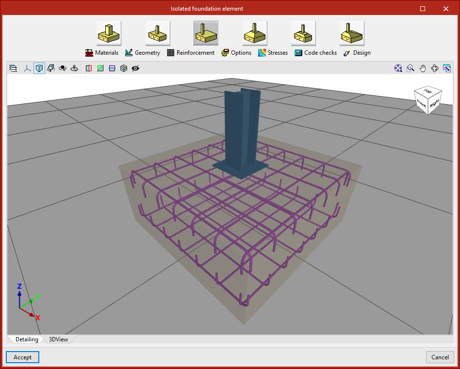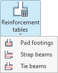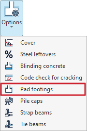 L'onglet inférieur ‘Fondation’ contient les outils de conception et de calcul des éléments de fondation. Le ruban supérieur d'options comprend :