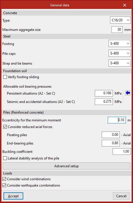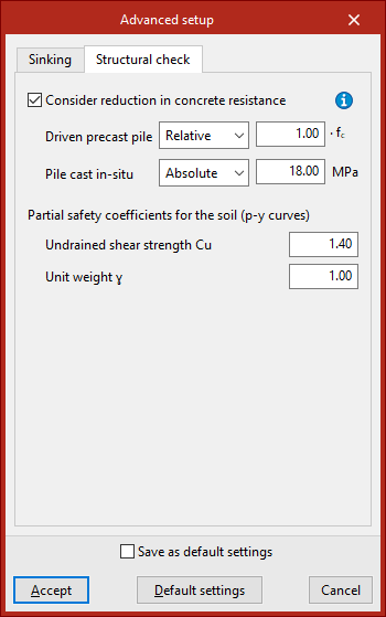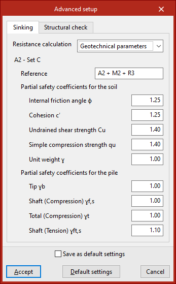Il est également possible d'accéder au panneau ‘Configuration avancée’, où sont définis les paramètres intervenant dans la vérification de l'enfoncement et dans la vérification structurale, dans leurs onglets respectifs.
