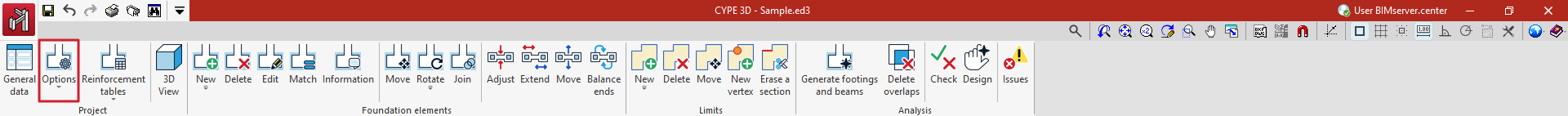 Les outils de configuration de la fondation sont disponibles dans le menu ‘Options’ du bloc ‘Ouvrage’ en haut de l'interface, dans l'onglet ‘Fondation’.