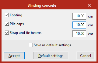 Cette option permet de prendre en compte l'épaisseur du ‘Béton de propreté’. Il est possible de l'intégrer aussi bien dans les ‘Semelles superficielles’ que dans les ‘Semelles sur pieux’ et les ‘Poutres de redressement et de liaison’, en cochant les différentes cases et en saisissant sa valeur.