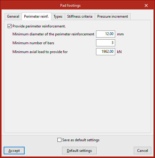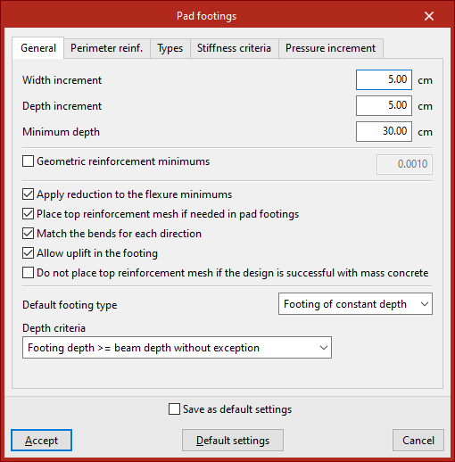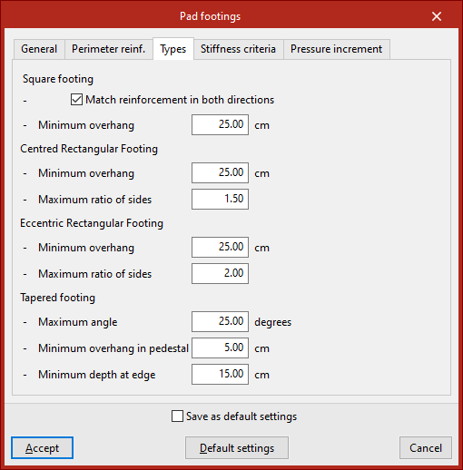 Dans les semelles pyramidales, établissez l'angle maximal, le ‘Débord minimum en piédestal’ (dans les directions où il n'y a pas de mur mitoyen ou d'angle) et la ‘Hauteur minimale au bord’, qui est la valeur la plus basse autorisée pour l’épaisseur dans le dimensionnement.