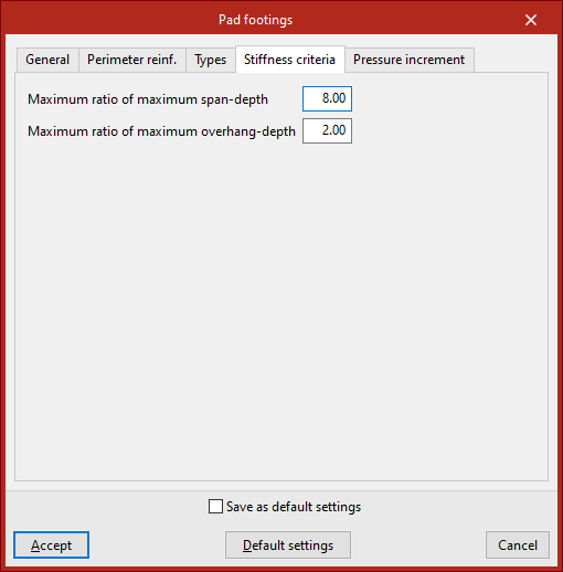 Dans les semelles rectangulaires centrées et excentrées, en plus du ‘Débord minimal’, indiquez le ‘Rapport maximal des côtés’, c'est-à-dire le rapport entre la plus grande et la plus petite largeur.