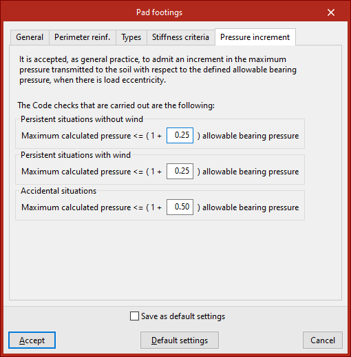 Dans le dernier onglet, le logiciel permet de définir une augmentation de contrainte maximale transmise au terrain par rapport à celle admissible en cas d'excentricité des charges. Par défaut, l'augmentation est de 25 %.