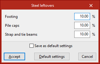 Cette option permet de définir un pourcentage de ‘Chutes d'acier’, tant pour les ‘Semelles superficielles’ que pour les ‘Semelles sur pieux’ et les ‘Poutres de redressement et de liaison’. Les chutes constituent une quantité supplémentaire d'acier qui est incluse dans les récapitulatifs des métrés du projet.